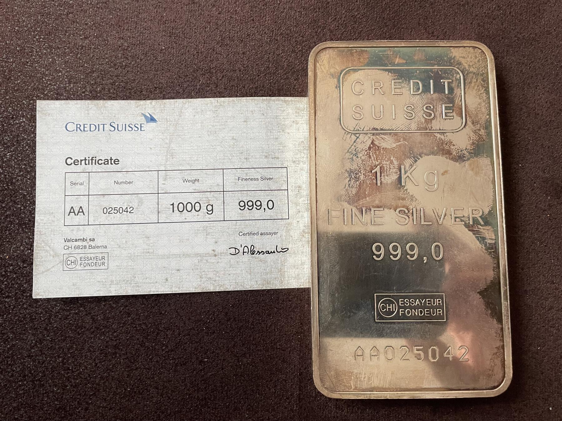 Silber Barren 1Kg - Credit Suisse mit Zertifikat